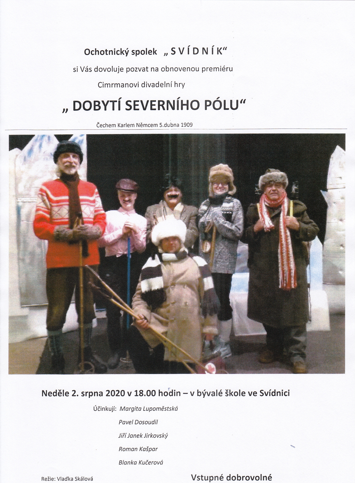 Místní ochotnický soubor "Svidník" zve na obnovenou premiéru hry "Dobytí severního  pólu" v neděli 2. srpna v 18 hodin v budově bývalé školy.